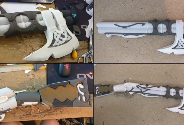 I started by turning an image of the gun into a template line drawing using PhotoShop. I then scaled up the drawing to life-size and taped together the sheets of paper, so I had a full-size plan. I wrapped two lengths of one-inch PVC pipe in foam, so that I could sculpt them. Next I used thick black foam to form the shape of the axe head, and thin white foam to add the blade edge and detail.