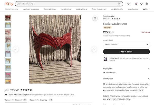 You can either buy a Scarlet Witch crown ready-made or 3D-print it yourself. Below are links to the most popular websites to help you pick your favourite design.