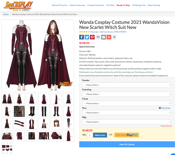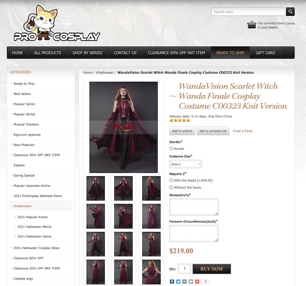 Cosplayer @not_an_addams bought her costume from Procosplay, an online store in China. The website page offers plenty of information, buying options and size guides.