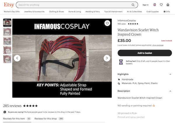 This Scarlet Witch headpiece received a rave review from @alexbraybrooke and has plenty of five star reviews from other cosplayers.