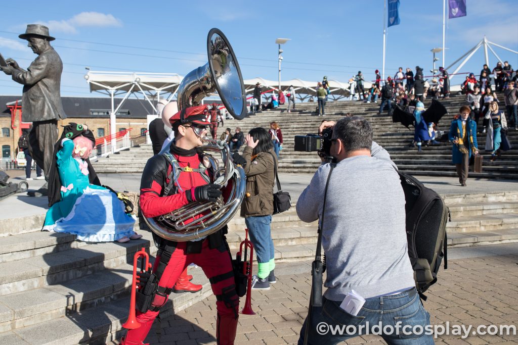 Take care not to appear in the picture yourself when your subject has mirror glasses/visor (get them to look away) or chrome elements to their cosplay (shoot from a lower position). Experiment.